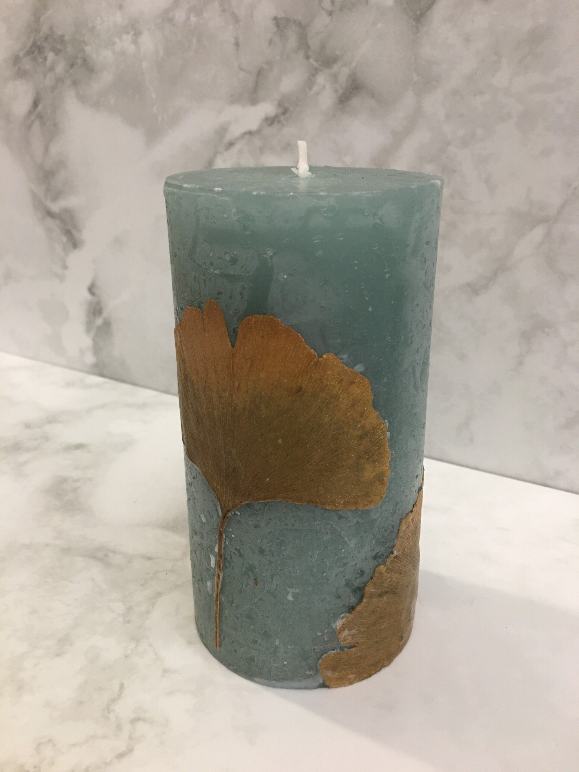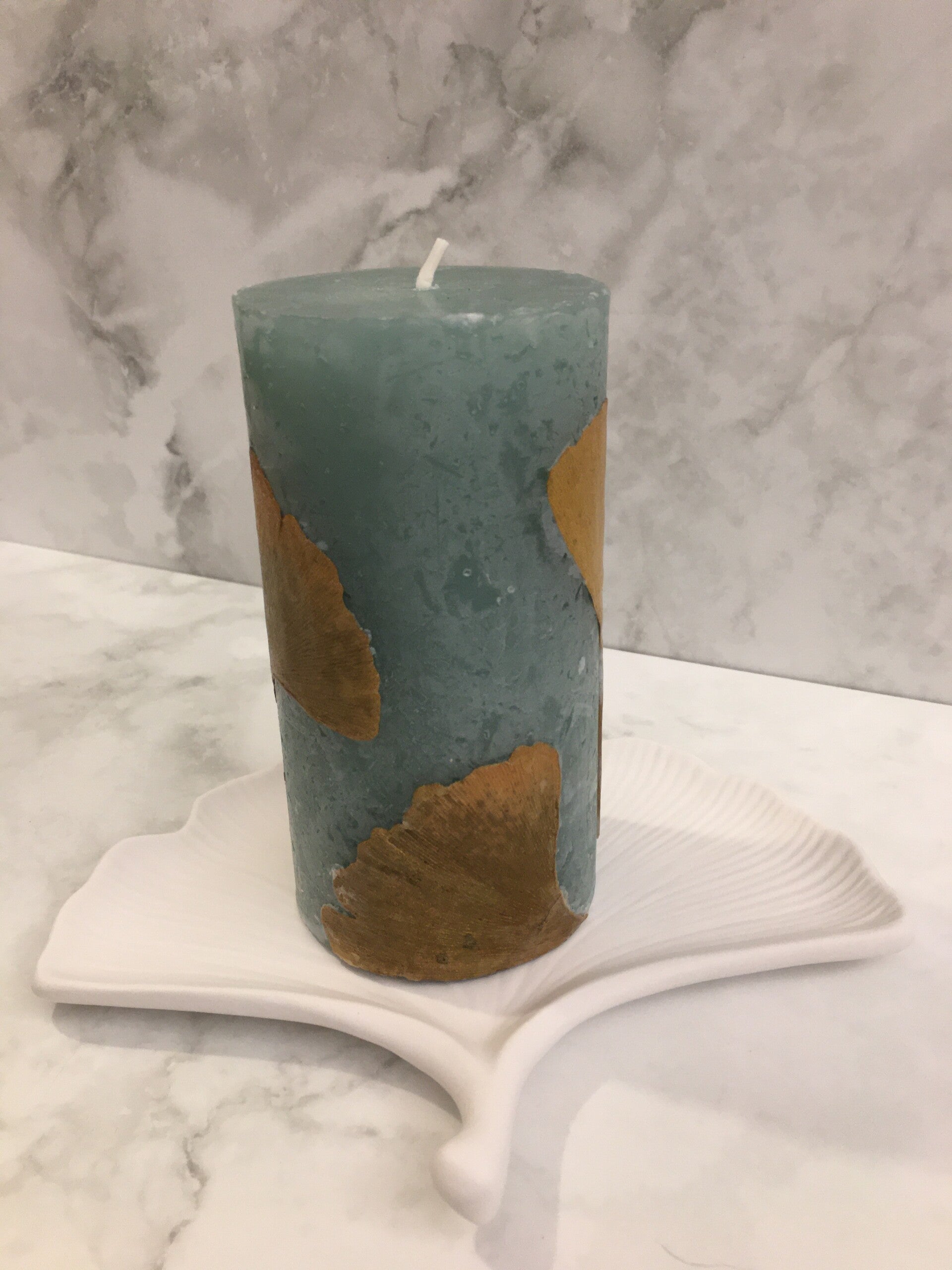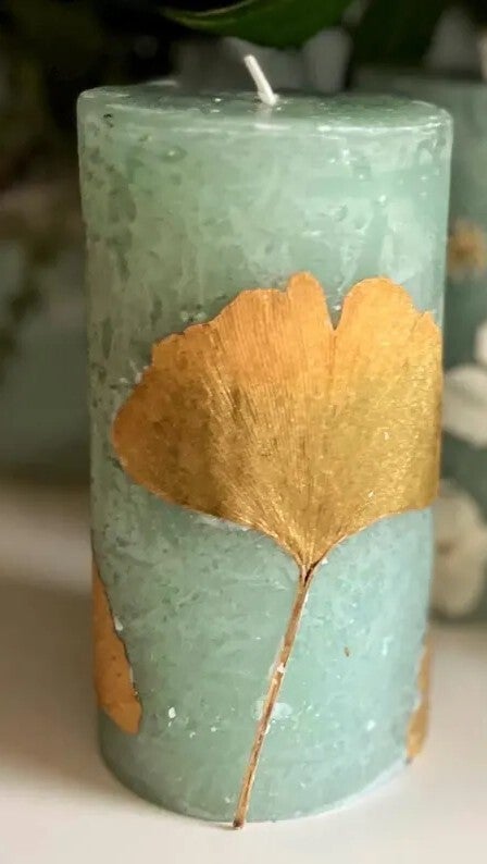 Botanische pilaarkaars met Ginkgo blad en Ginkgo blad onderzetter.