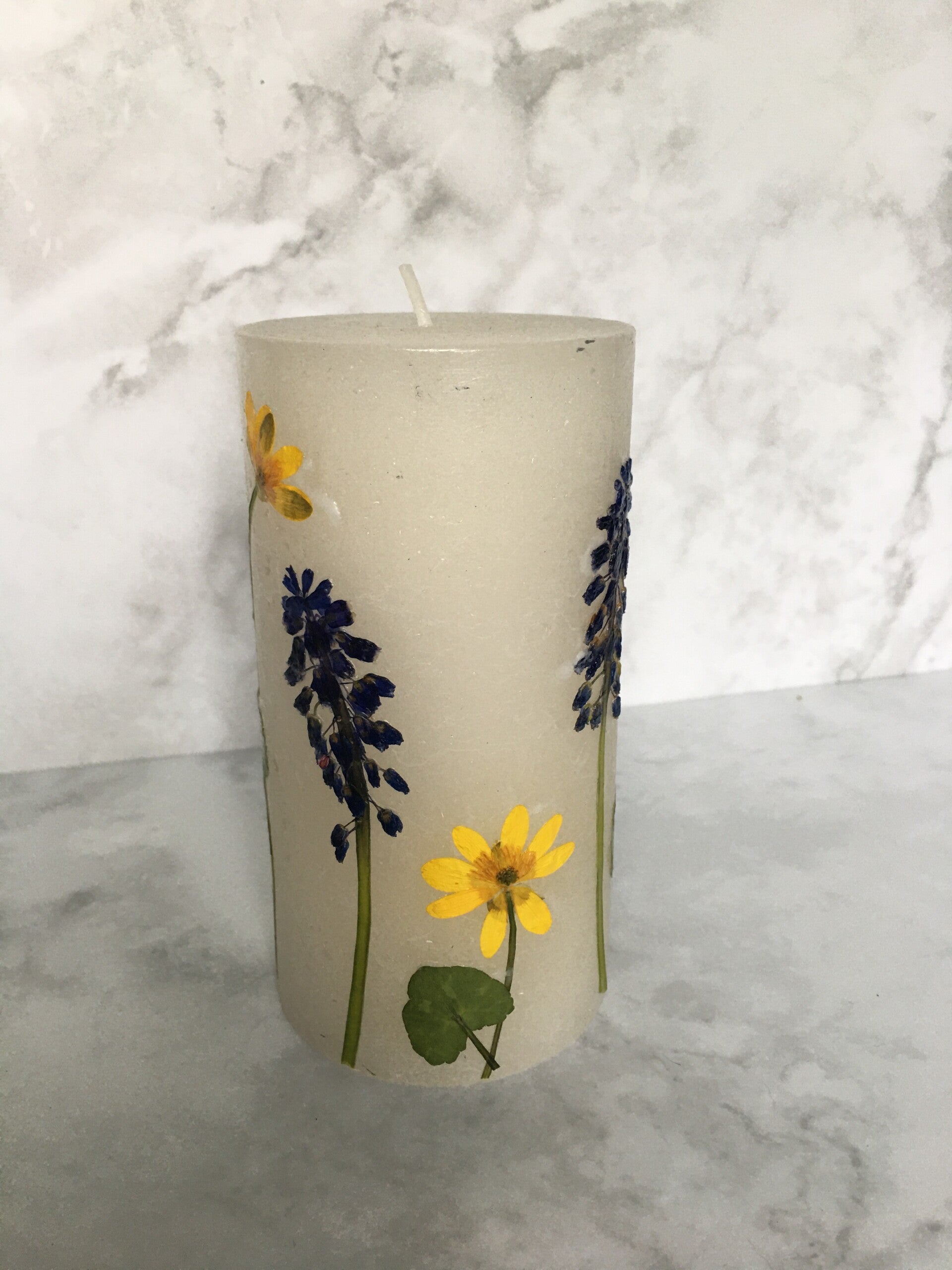 Botanische pilaarkaars met ECHTE geperste bloemen. Deze handgemaakte pilaarkaars brengt een beetje lente in huis! Als ze branden, gloeien de bloemen zachtjes door de was, waardoor een warme en gezellige sfeer ontstaat. Perfect om te decoreren, te ontspannen of cadeau te geven aan een natuurliefhebber! 100% Veganistisch & Vegetarisch - Gemaakt van hoogwaardige, plantaardige was.