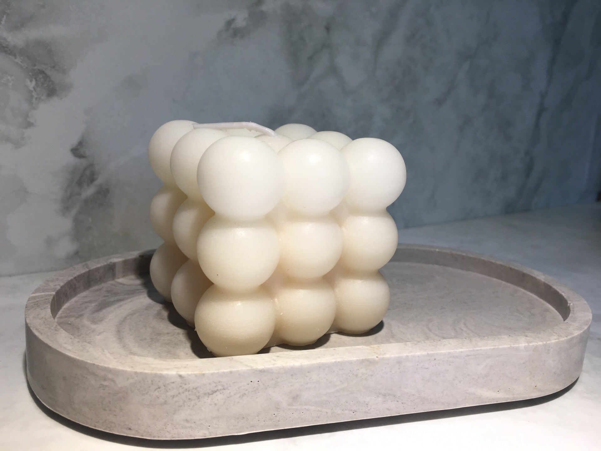 Prachtig dienblad in grijze marmerlook gemaakt van Jesmonite met witte bubble kaars.