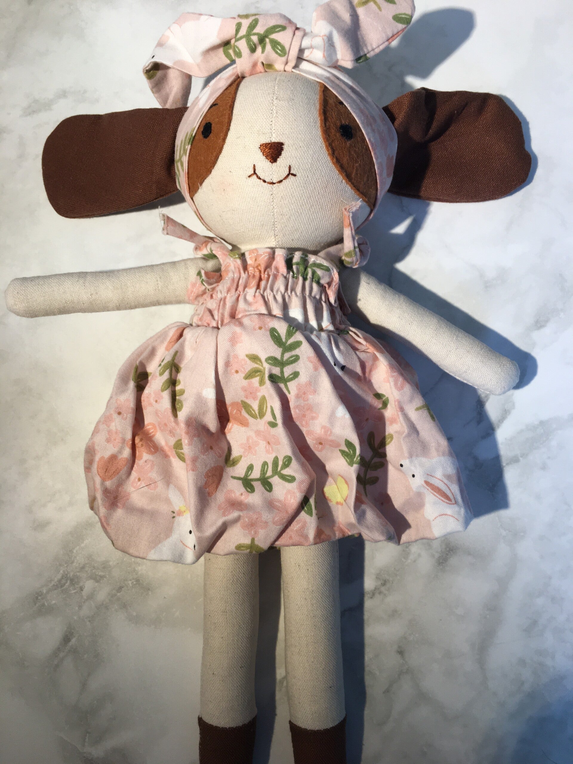 Deze handgemaakte pop is gemaakt van milieuvriendelijke organische linnen stof en gevuld met polyester fiberfill. Alle details zijn zorgvuldig met de hand gemaakt en geborduurd.