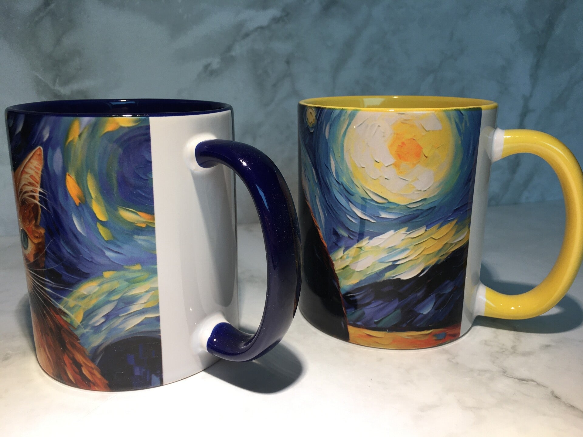 Eén mok is aan de binnenkant geel en de andere mok is aan de binnenkant donkerblauw.