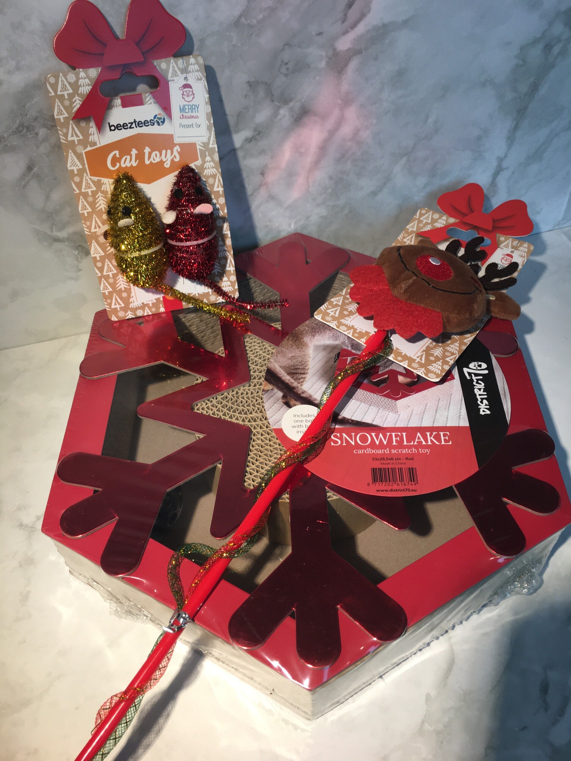 Krabkarton sneeuwvlok rood met kattenhengel rendier en 2 kerstmuizen