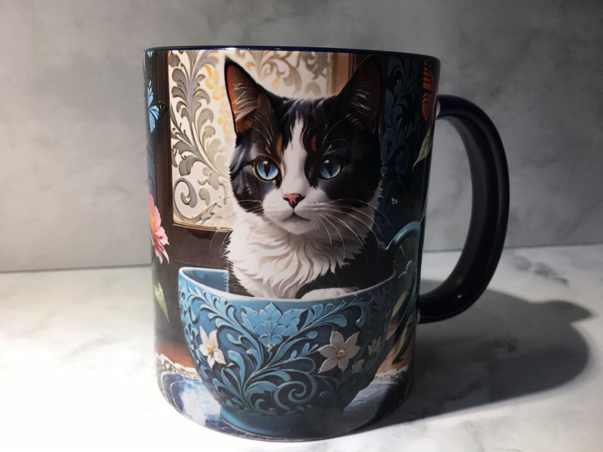 De mok is aan de binnenkant donkerblauw.