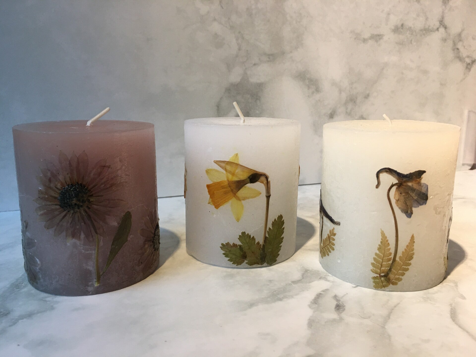 Elke kaars is uniek, met zorgvuldig geplaatste bloemen en bladeren. Na verloop van tijd kunnen de planten iets donkerder worden, wat bijdraagt aan de natuurlijke, vintage charme. Omdat deze kaarsen met echte planten zijn gemaakt, zullen er nooit twee precies hetzelfde uitzien!