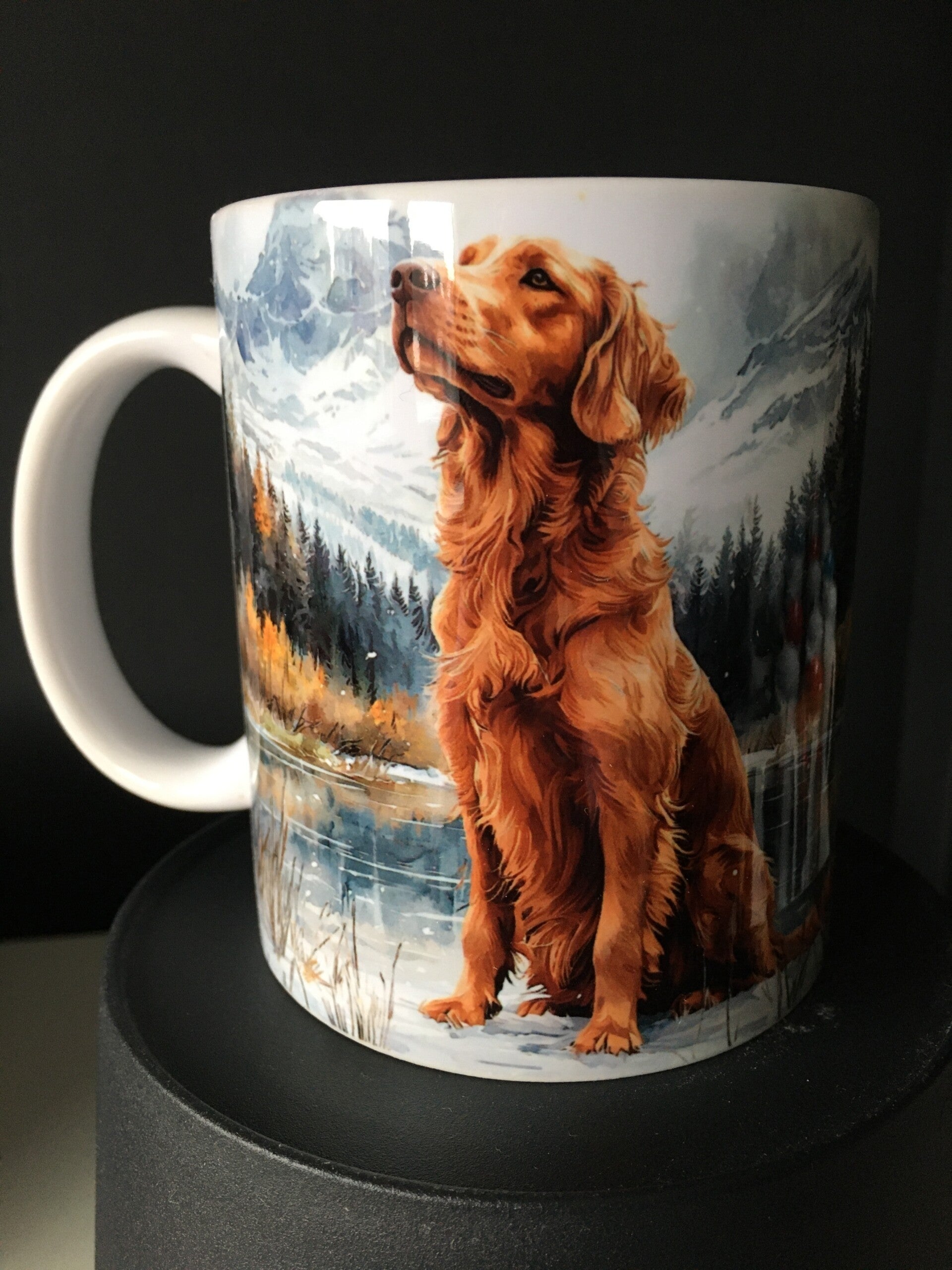 De mok is 360 graden bedrukt met uitzondering van het deel aan de handgreep dat wit is.