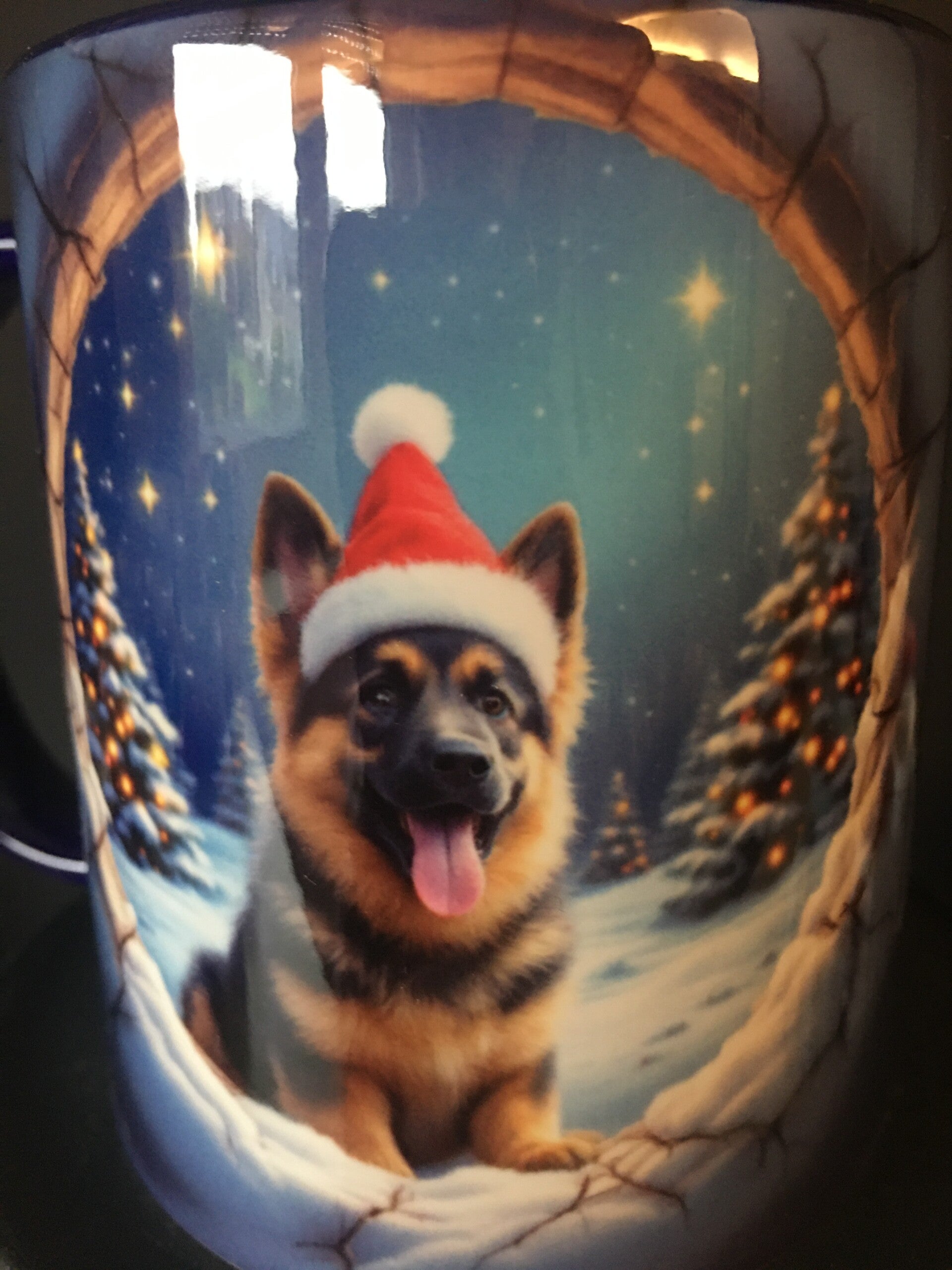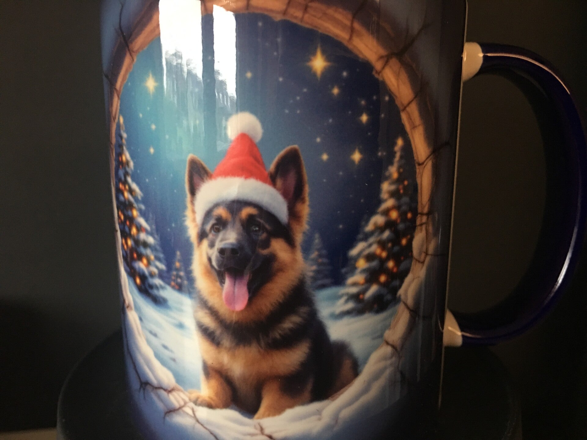De mok is 360 graden bedrukt met uitzondering van het deel aan de handgreep dat wit is.