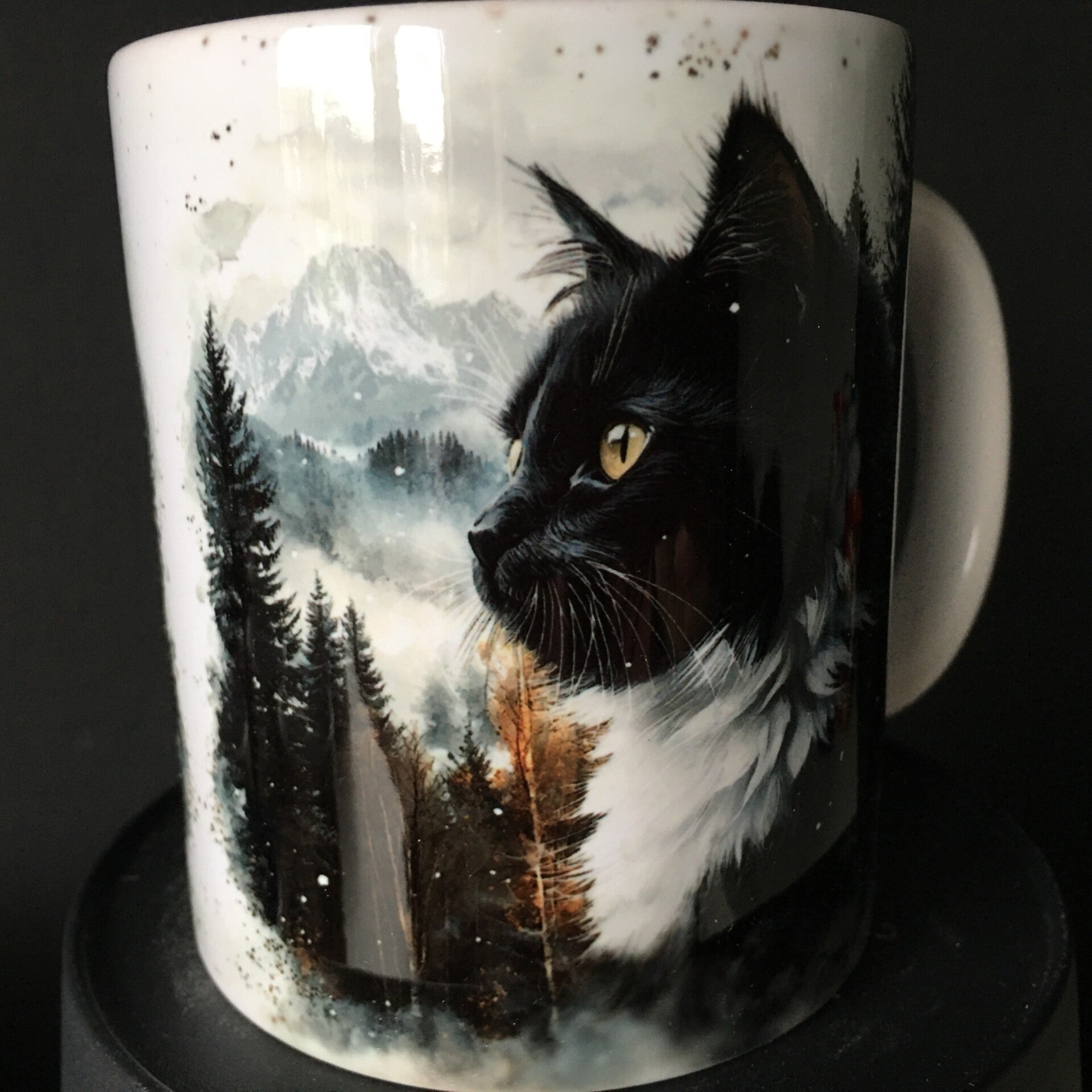 De mok is 360 graden bedrukt met uitzondering van het deel aan de handgreep dat wit is.